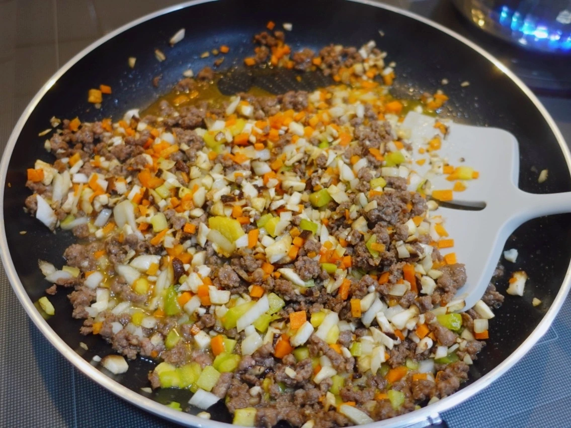 3. 기름 두른 팬에 (1)의 고기를 넣어 볶다가 반쯤 익으면 당근, 애호박, 양파, 표고 순으로 넣어 타지 않게 볶는다.