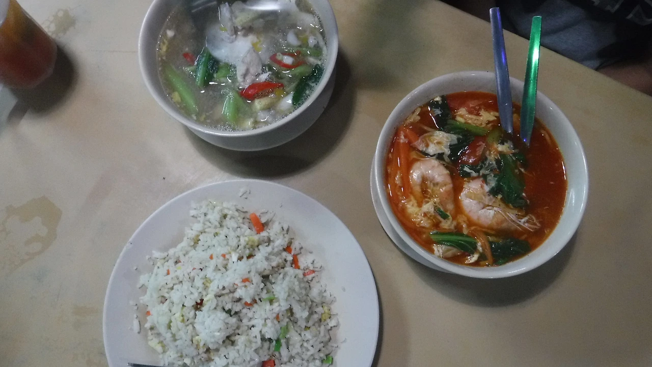 샤워 마치고 잠시 쉬다 1930 나가서 'Ajid cafe'에서 로컬푸드로 푸짐하고 저렴한 저녁식사. 중국식 볶음밥, 똠얌국수, 새우국수, 콰이테우누들, 오징어튀김에 레몬티까지 잘 먹고 들어오다 편의점에서 컵라면 두 개 구입. 내일은 또 랑카위로 이동하는 날. 아침 먹고 바로 공항 가야해서 오늘은 일찍 잠자리에 드는 걸로! ⓒ혁신가이드안병민