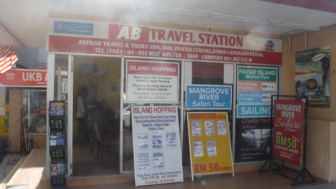 1500 숙소 인근 '토마토식당'에서 현지식 뷔페 '나시칸다르'로 늦은 점심식사. 1600 '체낭몰' 들어가서 선우 'Fipper' 쪼리 하나 사고 인근 거리 돌아보다 내일 갈 '파야(Payar) 섬 스노클링 투어' 예약(어른 150에 어린이 120으로 울 네 가족 비용은 총 580링깃). 거리에 있는 어지간한 곳들 다 들어가서 물어봤는데 'AB모텔' 바로 옆 'AB Travel'이 젤 쌈^^.