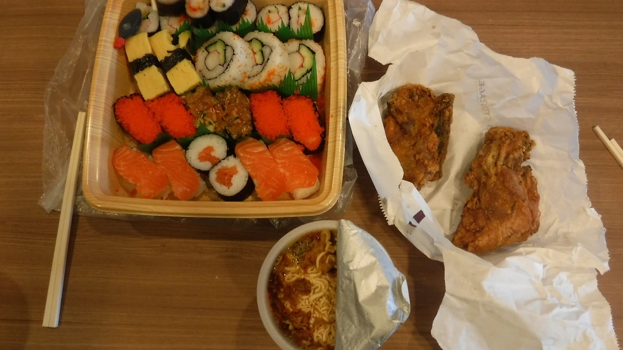 0830 일어나서 어제 사 온 초밥과 현지 컵라면으로 아침 먹고 1000 오늘은 5층 수영장 가서 시우와 물놀이.