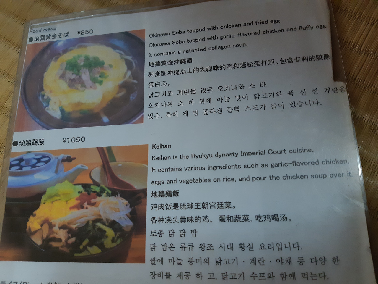 1130 ‘해양박공원’ 도착. ‘추라우미수족관’을 포함한 대규모 파크. 듀공도 보고 돌고래쇼도 보고. 1240 바로 근처 ‘코코식당’ 가서 점심식사. 닭육수 소바와 닭밥. 구수한 닭육수가 맑고 깊음.