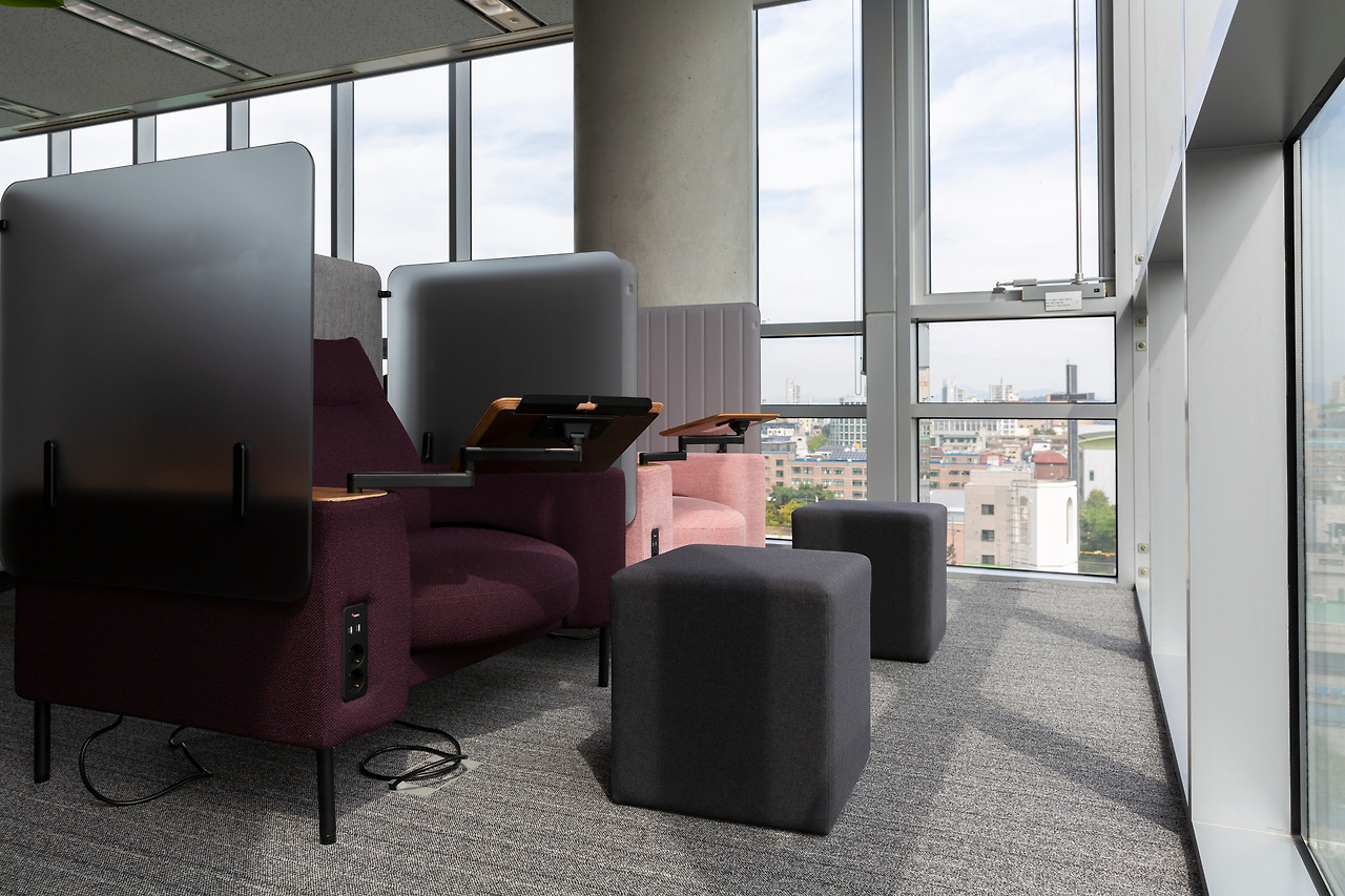 이러한 방향 아래 퍼시스는 이에 맞춤하는 공간을 만들어 나갔다. 자율좌석 같은 거다. 아침에 출근하면 내가 원하는 자리를 내가 선택해서 앉을 수 있도록 한 거다. 집중해서 해야 할 업무, 소통하며 해야 할 업무 등 그날의 업무 성격에 따라 자리를 고를 수 있도록 했다. 다양한 형태의 공간을 배치하여 자유롭게 일할 수 있도록 했다. 로비의 라운지 공간도 자연스레 업무공간의 연장선에 올랐다. 내가 일하는 곳이 곧 사무실이란 생각이었다.