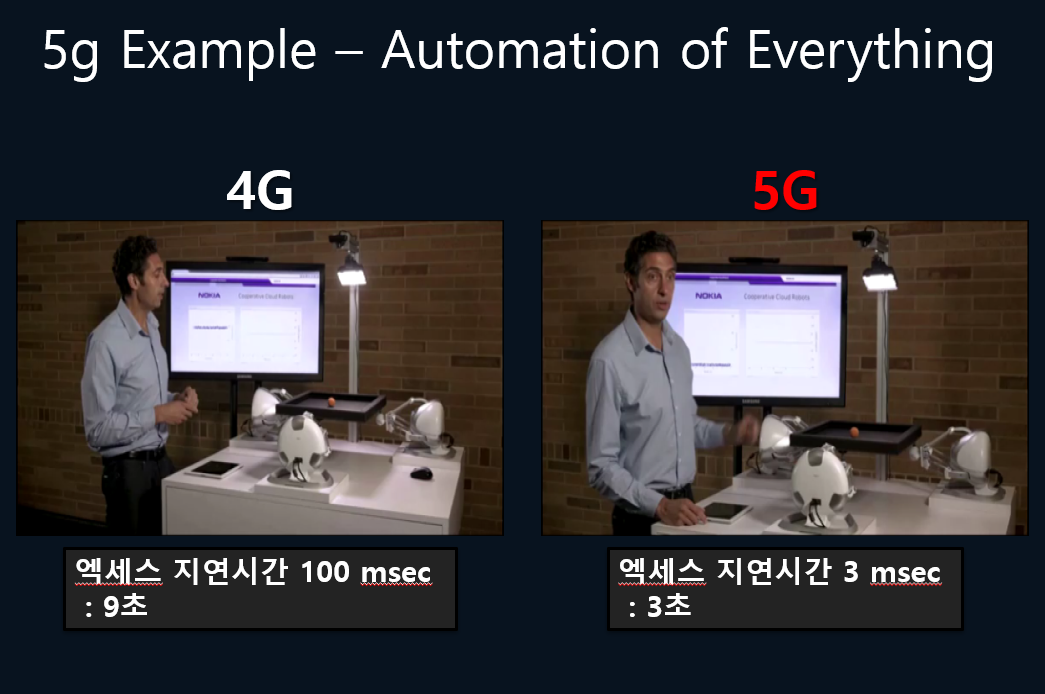 앞서, 4G는 핸드폰을 컴퓨터로 바꿔버린 변화라 했다. 그렇다면 5G는 어떻게 보아야 할까? “5G는 사람을 대상으로 하는 게 아닙니다. 사람을 넘어 기계가 통신을 잘 할 수 있도록 하자는 게 5G의 핵심컨셉입니다.” 홍대식 교수의 설명은 허를 찔렀다. 사물인터넷 얘기였다. 이어진 동영상 장면. 마이크로소프트가 2015년에 만든 <2020 미래 비전> 동영상이다. 실시간 영상과 증강현실, 모션인식 등에 기반한 원격수업, 휘어지는 디스플레이 기술을 접목한 카페 장면, 개인 식별장치와 웨어러블 디바이스 등으로 표현되는 원격사무실, 실시간 접속과 영상 등으로 구현되는 원격의료 꿈만 같은 세상이 영상에 가득하다. 하지만 더 이상 꿈이 아닌 모습들. 이 모든 게 수십 기가의 데이터가 눈 깜빡할 새 오갈 수 있는 환경이 전제되어야 한다. 관건은 초저지연, 즉 딜레이타임의 최소화다.