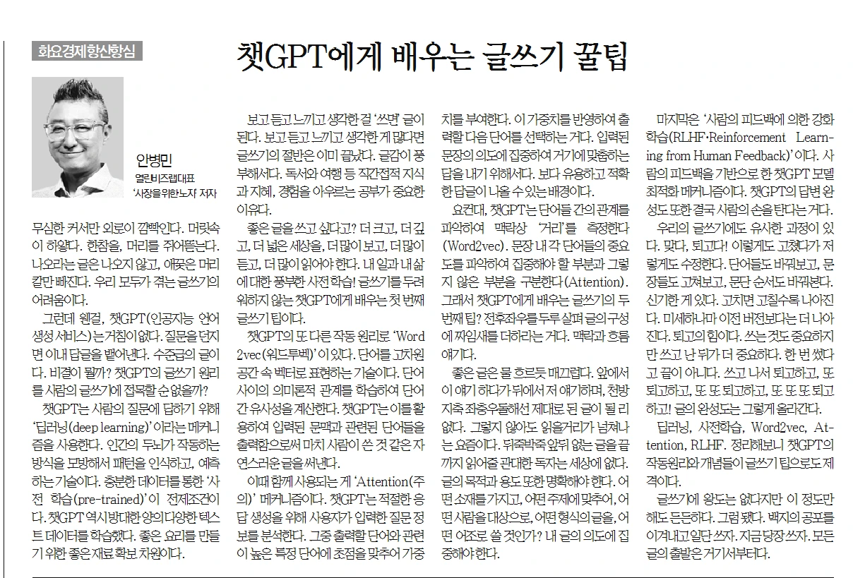 딥러닝, 사전학습, Word2vec, Attention, RLHF. 정리해보니 챗GPT의 작동원리와 개념들이 글쓰기 팁으로도 제격이다. 글쓰기에 왕도는 없다지만 이 정도만 해도 든든하다. 그럼 됐다. 백지의 공포를 이겨내고 일단 쓰자. 지금 당장 쓰자. 모든 글의 출발은 거기서부터다. ⓒ혁신가이드안병민