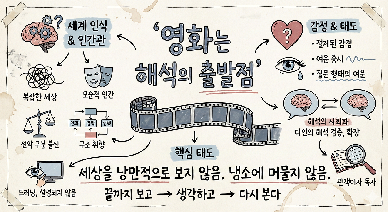 영화에 대한 태도에서 가장 특징적인 지점은 ‘해석의 사회화’다. 혼자 결론을 닫지 않는다. 타인의 해석을 적극적으로 찾는다. 공감받기 위해서가 아니다. 자신의 해석을 검증하고 확장하기 위해서다.