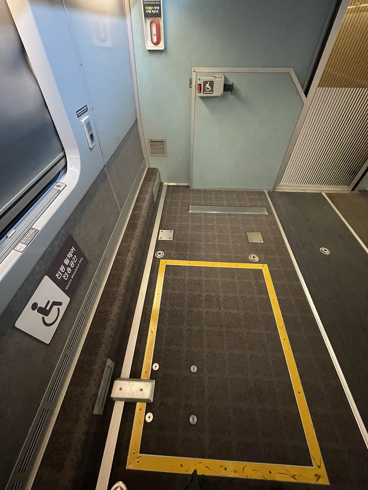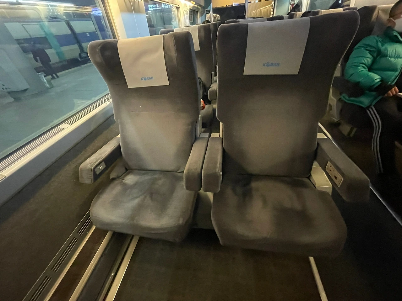 안전띠가 없는 KTX 좌석 (전동 휠체어 전용공간에는 별도의 고정벨트가 있다. 왼쪽 사진)