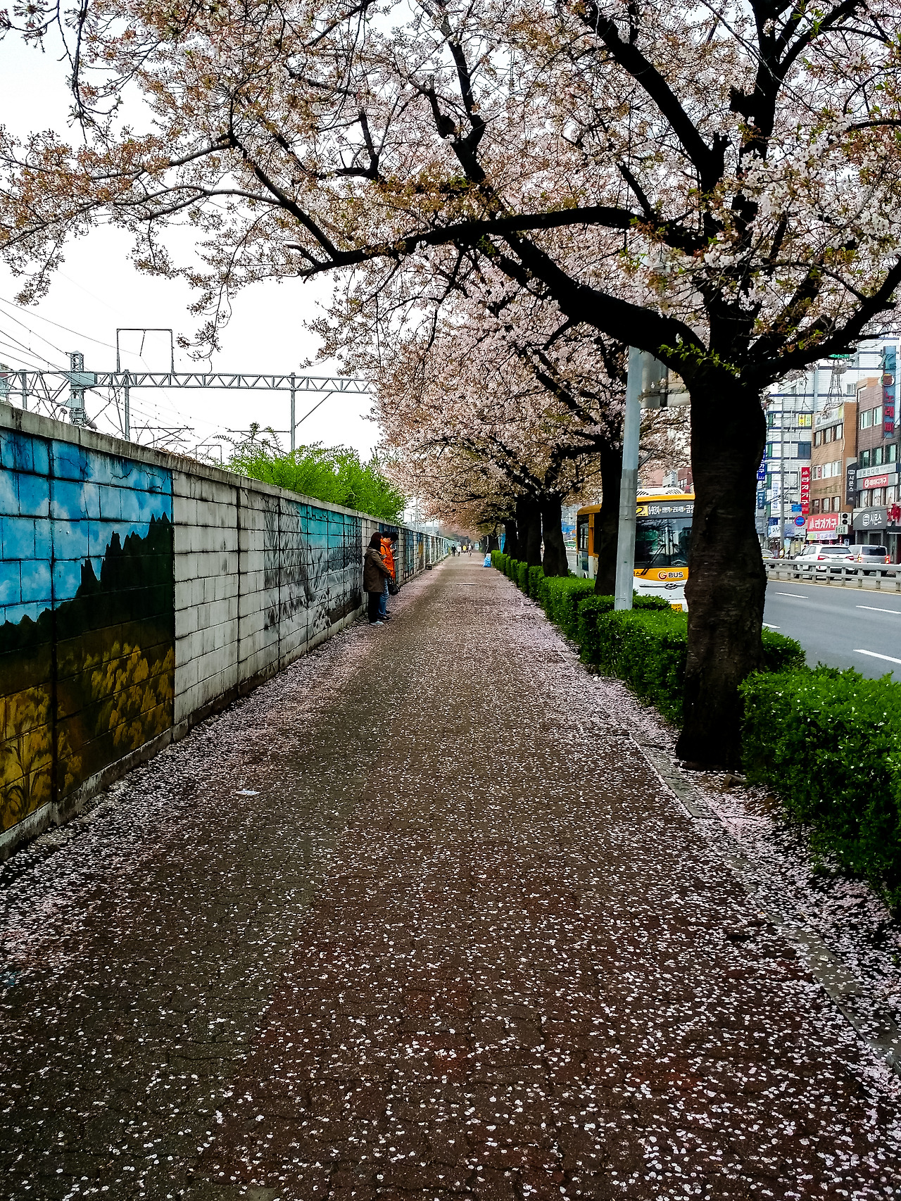 어느 날 간밤에 온 비로 길이 채 마르기도 전인데 아뿔싸 꽃잎이 너무 많이 떨어졌다. 아쉬운 마음을 품고 저 끝을 바라보니 평소 보기 어려운 장관이 펼쳐지고 있었다. 떨어진 꽃잎이 만들어내 또 하나의 장관은 마치 천국 길을 걷는 것 같은 착각을 일으키게 만들 정도였다.