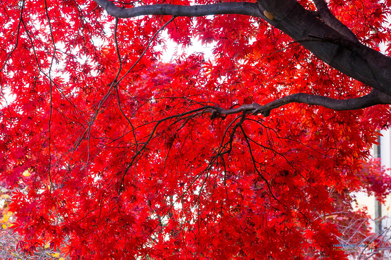 가을 산의 아름다운 정취를 기대했지만, 생각보다 볼품이 없었다. 칙칙한 나무색과 나뭇잎이 다 떨어져 앙상하게 가지만 남은 풍경은 을씨년스럽기만 했다. 체념한 체 지나가다가 판매를 위해 묘목을 심어 놓은 곳을 보게 되었다. 대부분 향나무 묘목이었는데 그 가운데 우뚝 선 한그루 단풍나무가 있었다. 단연코 그 색의 아름다움이 돋보였고 질퍽한 땅을 가로질러 그 나무를 만났다.