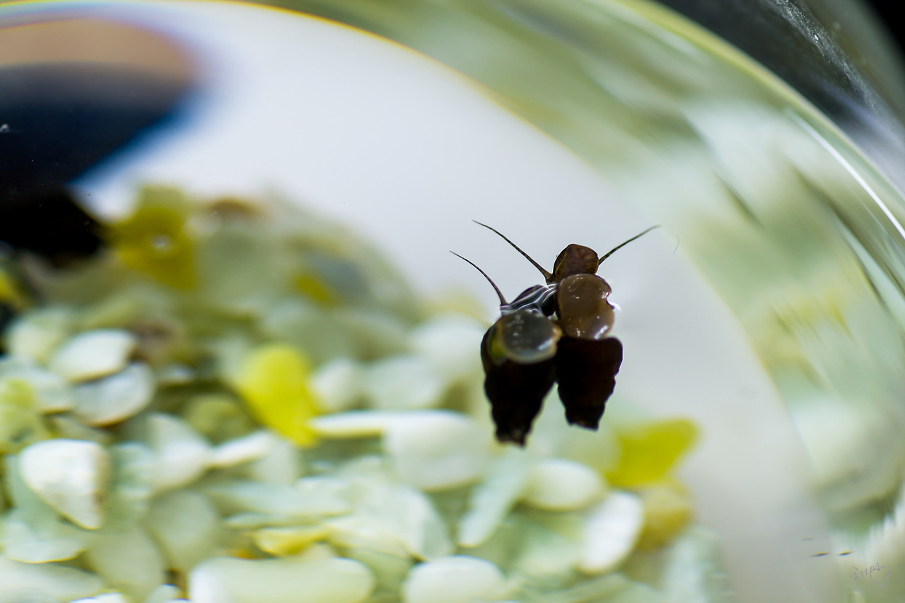 잘 살펴보면 다슬기의 흡착판이 약간 오목해지면서 배 모양이 되어 몸 전체를 물 위를 띄울 수 있게 만드는 것 같다.
