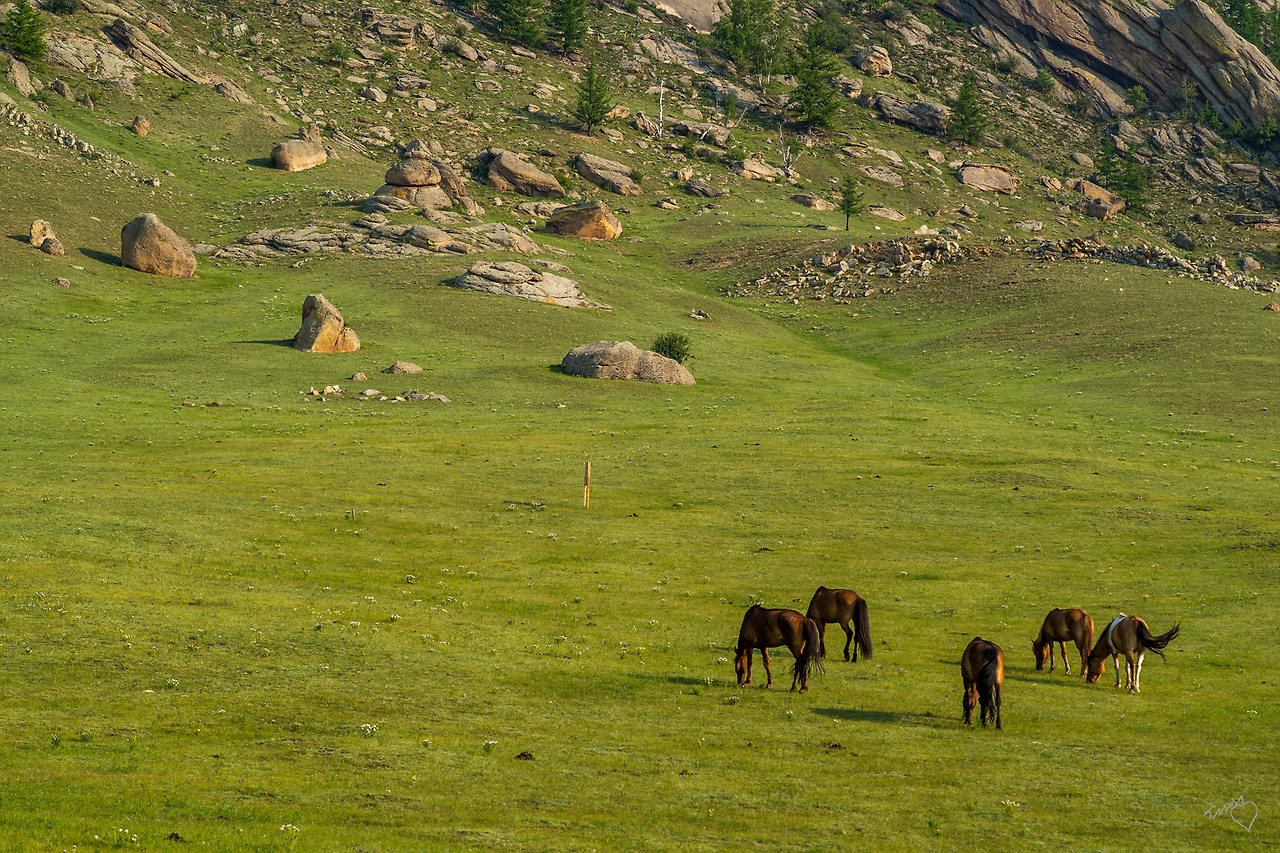 해발 1500미터에 위치한 몽골의 초원은 광활하다. 해가 뜨기 전인 6시에 산에 올라보니 말들이 먼저 올라와서 한가로이 풀을 뜯고 있었다. 몽골의 초원에 자라는 풀들은 키가 클 틈이 없다. 채 자라기도 전에 말, 양, 염소, 소들이 새순이 돋아나는 족족 부드러운 것만 골라서 다 뜯어먹기 때문이다. 이렇게 넓은 땅에 풀이 우거지면 감당하기 어려울 만큼 자라날 텐데, 기후와 동물들의 식사의 절묘한 조화로 그 넓은 광야가 마치 양탄자같이 다듬어져 있었다.
