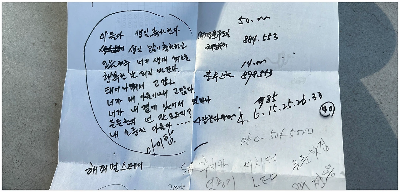 생일 축하 메모였어요. 보내기 쑥스러웠는지 아니면 나중에 문자로 보내주시려 했는지 알 수는 없지만 그 짧은 손편지가 아버지께서 내게 남기신 유언이 된 것이죠.