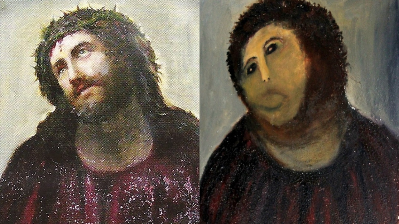 보르하에 있는 자비의 성당에는 1930년 경 그려진 에케 호모, Ecce Homo(라틴어 : 보라, 이 사람을)라는 작은 벽화 작품이 있었다. 가시관을 쓴 예수 그림이다. 세월 탓인지, 그림이 훼손되자, 교회는 복원을 하기로 한다. 문제는 지금부터다.