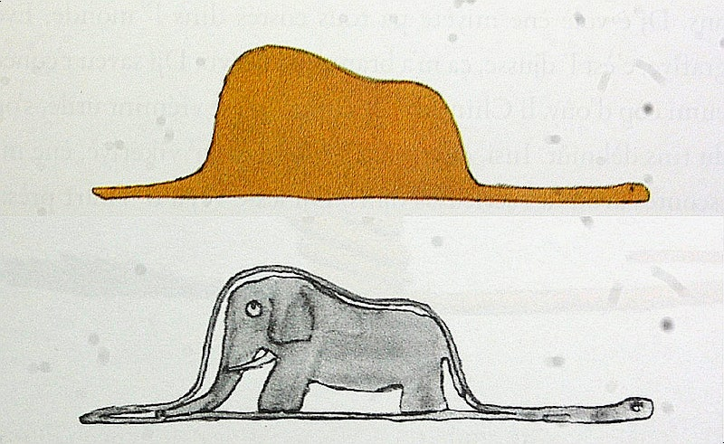 어른들은 그림을 이해하지 못한다. 이건 분명 코끼리를 삼긴 배불뚝이 보아뱀이 아닌가. 그런데도 이해를 못 하다니, 생텍쥐페리는 답답하기 짝이 없었다. 왜일까? 못 생긴 그림 때문이다. 맞다. 이게 다 생텍쥐페리 잘못이다. 그런 탓에 작가는 하등에 쓸모없는 그림을 포기하고 누구에게나 쓸모 있는 지리, 역사, 수학 등을 공부하게 됐다나. 아무튼.