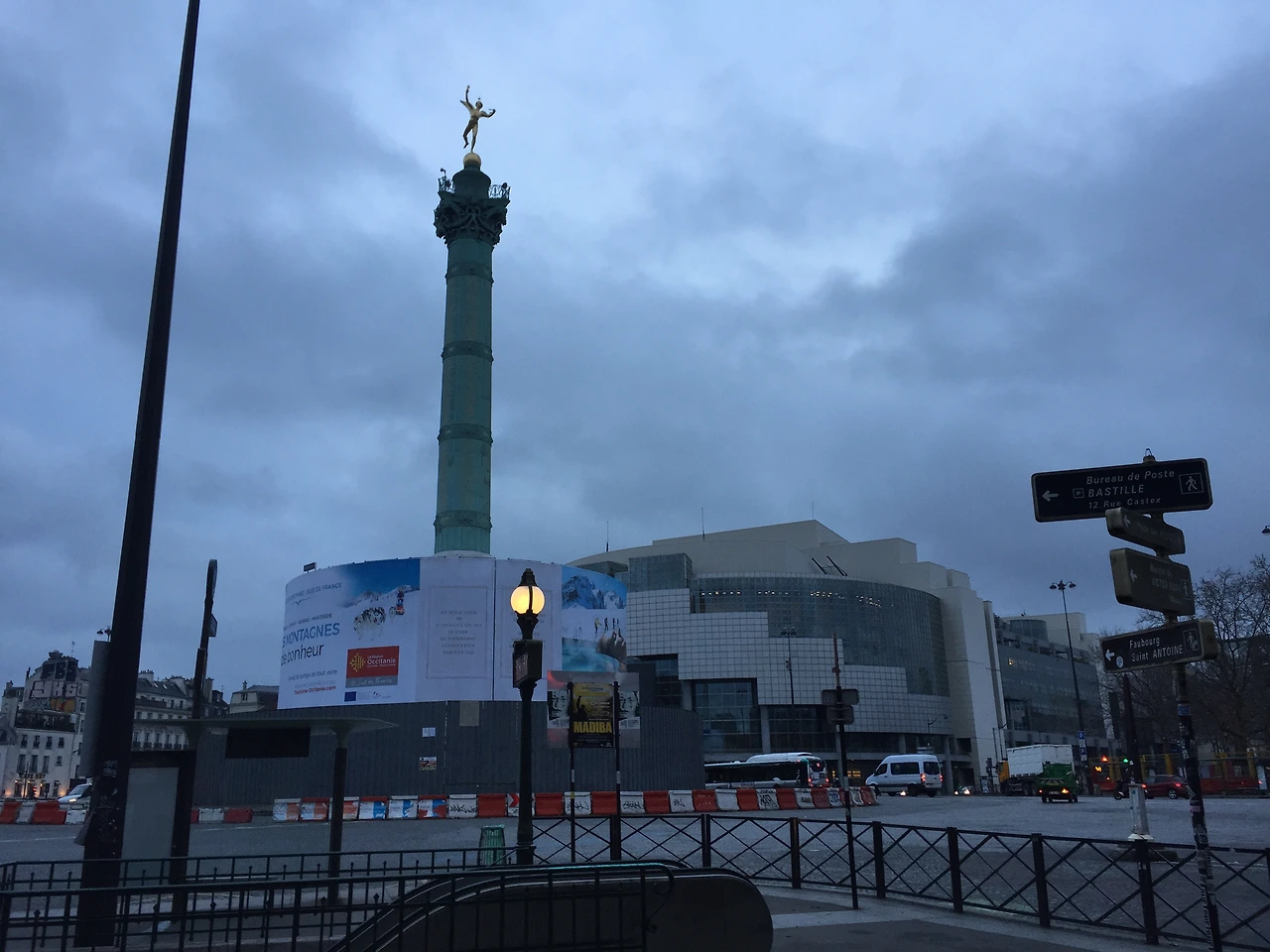 그 뒤로 거대한 둥근 유리벽의 오페라 바스티유 극장이 보입니다.