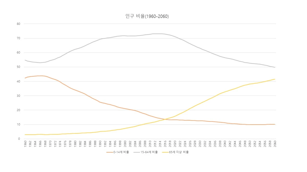 그래프를 한마디로 표현하면 초고령화 사회입니다.