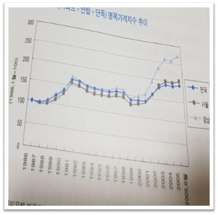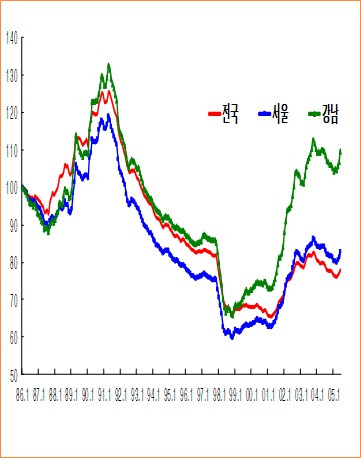 1986년=100로, 전국 기준으로 1991년 160, 2001년까지 안정세, 2001년 부터는 급등세로 보입니다. 2005년 6월의 경우 거의 200을 넘어섭니다. 강남의 경우 전국과 비슷하게 2001년 이후 급등하여 당시(2005년 6월) 270까지 치솟게 됩니다.