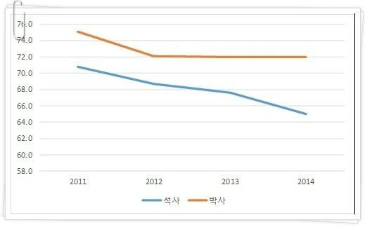 그러나 석사의 경우, 2011~2014년까지 꾸준히 하락하고 있습니다.