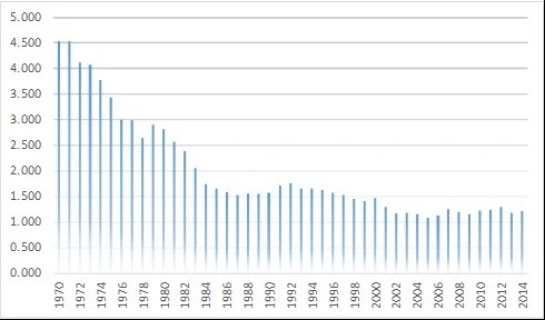 아래의 그래프를 보시면 80년대 이후 급격하게 출산율이 급감하고 있습니다.