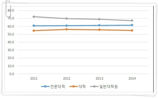 아래 그래프를 보시면 아시겠지만, 전문대학과 대학교의 경우 취업률의 변화는 거의 없습니다.