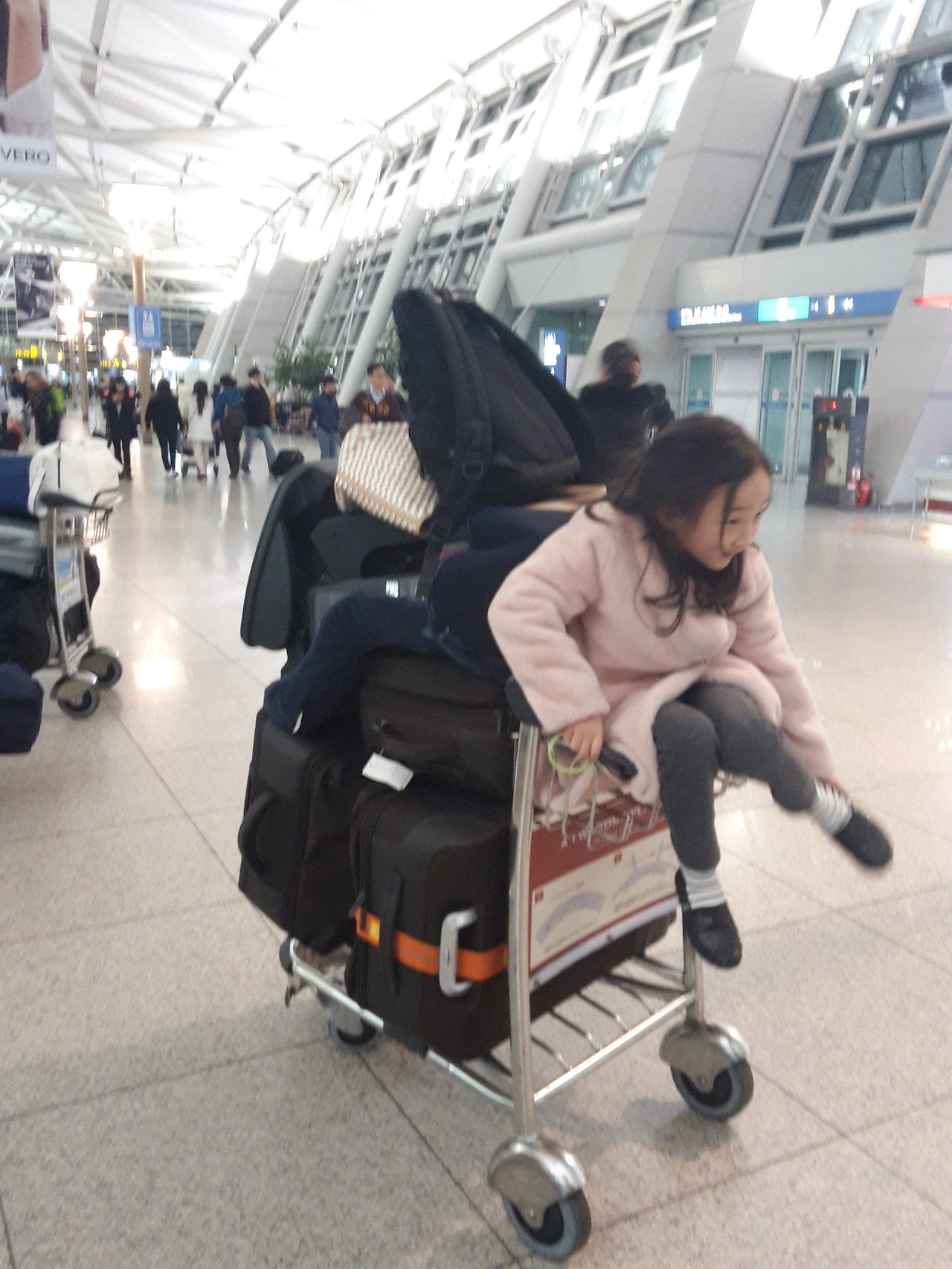 하지만 현실은 잔인했다. 탑승 전의 혼란스러움은 탑승 후의 아비규환에 비하면 애교 수준이었다. 밤 10시에 이륙하여 8시간 비행이니, 애들 재우고 나면 여유로운 비행이 되지 않을까 기대했건만, 지아가 거의 밤을 꼴딱 새우며 징징댔고, 그로 인해 나머지 3인 역시 초췌한 몰골로 이어지는 비행이 되었다. 그나마 손주 좀 키워보셨을 것 같은 할머니 네 분께서 우리 앞 좌석에 앉으셔서 지아의 징징거림을 견뎌주셔서 다행이었다.