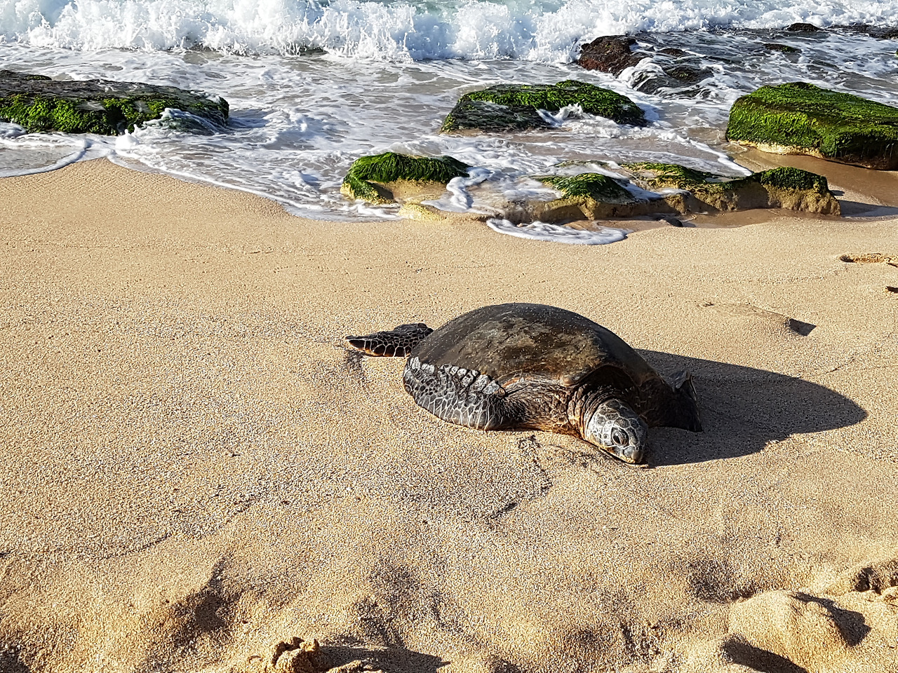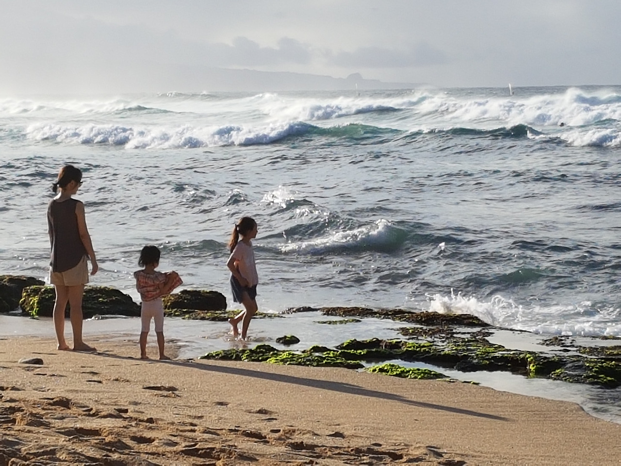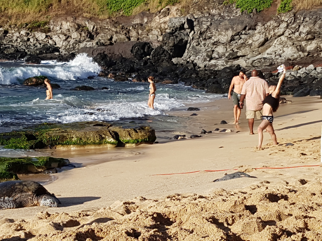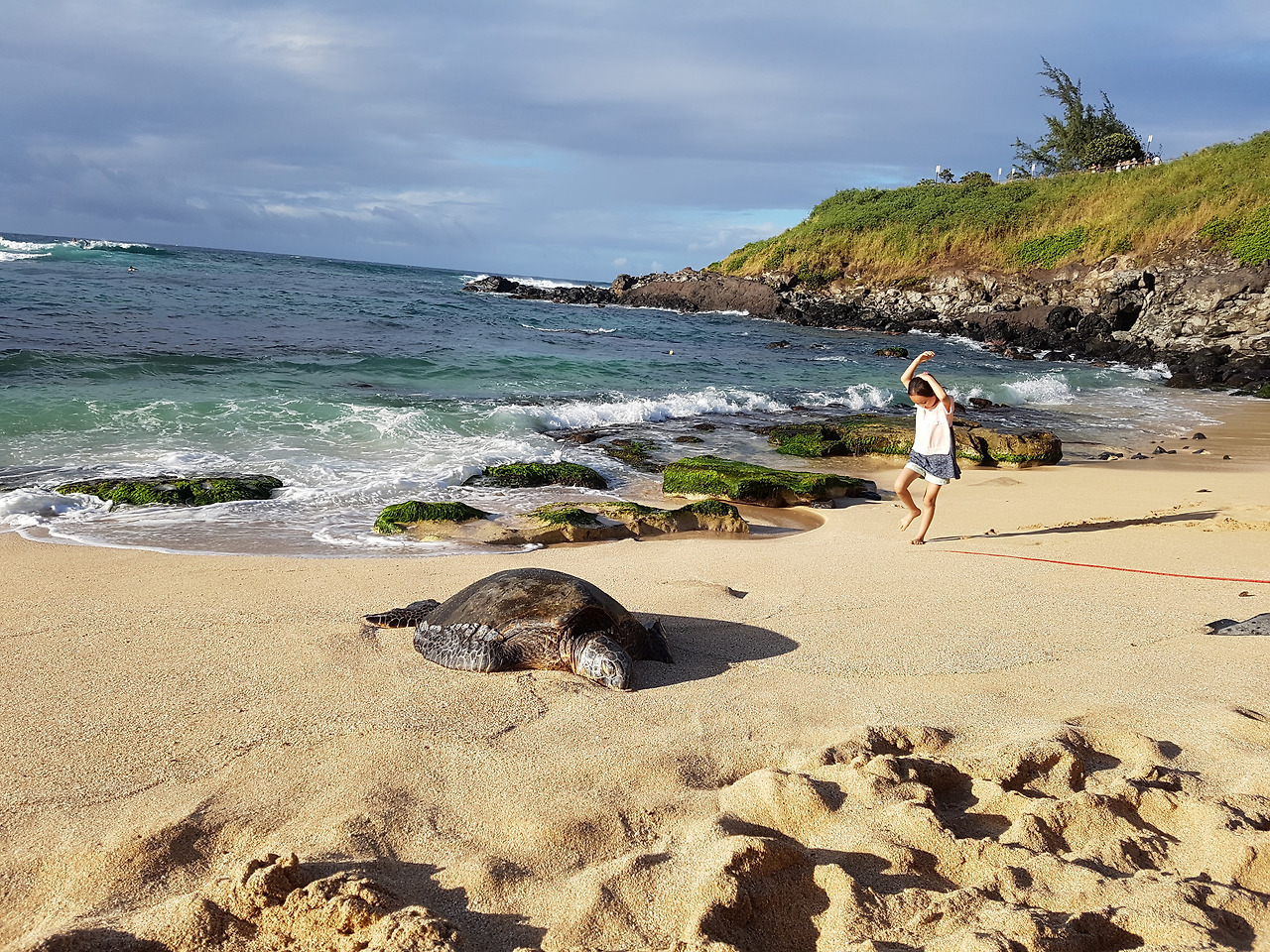 Hookipa Beach는 바위와 산호가 많아서 나름 스노클링 하기는 좋을 것 같았다. 운 좋으면 저기 박제처럼 누워있는 거북이들이 모래사장으로 출퇴근하는 동안 물에서 마주칠 수 있지도 않겠는가. 다만 파도가 너무 강해서 아이들 뿐만 아니라 어설픈 어른들도 호기롭게 들어갈 바다는 아니었다. 바다에선 나 역시 어설픈 어른에 속하는지라, 아이들과 파도가 부서지는 곳에서만 찰랑거리고 놀았다.