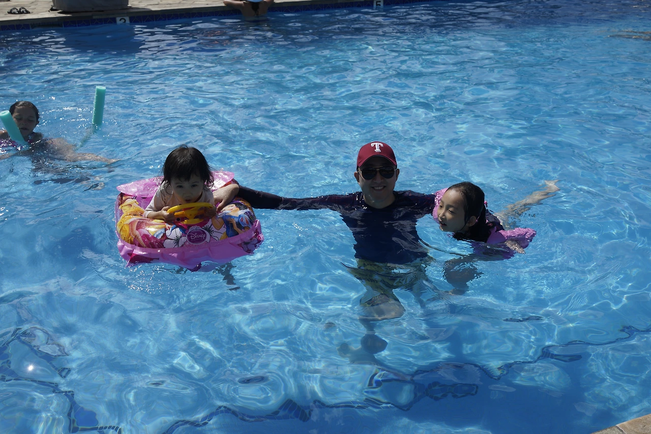 그러다 70은 확실히 넘어 보이는 할머니 한 분이 근처에서 책을 읽고 계신데, 에너지를 주체하지 못하는 아이들이 크게 물을 튕겨서 – 수영장에서 물을 튕기는 걸로 죄스러워하다니 – 그 할머니의 책에 젖을 뻔했다. 한두 방울은 사실 튀었다. 내가 Sorry 했더니, 살짝 웃어주셨다. 우린 "I’m sorry"에 대한 대답은 기계적으로 “That’s OK”라 배웠는데, 미소가 훨씬 감정 전달이 잘 되는구나. 혹은 할머니가 영어를 모르시거나.