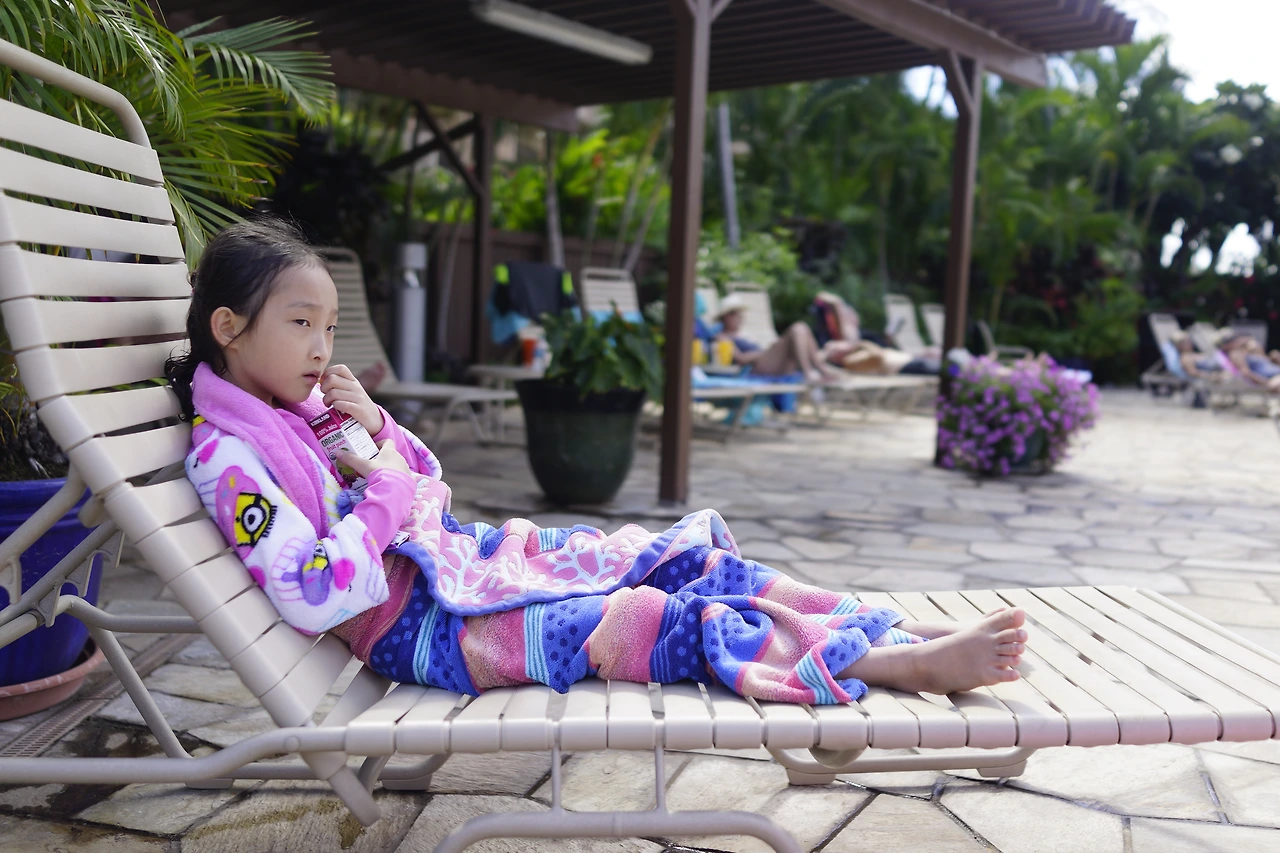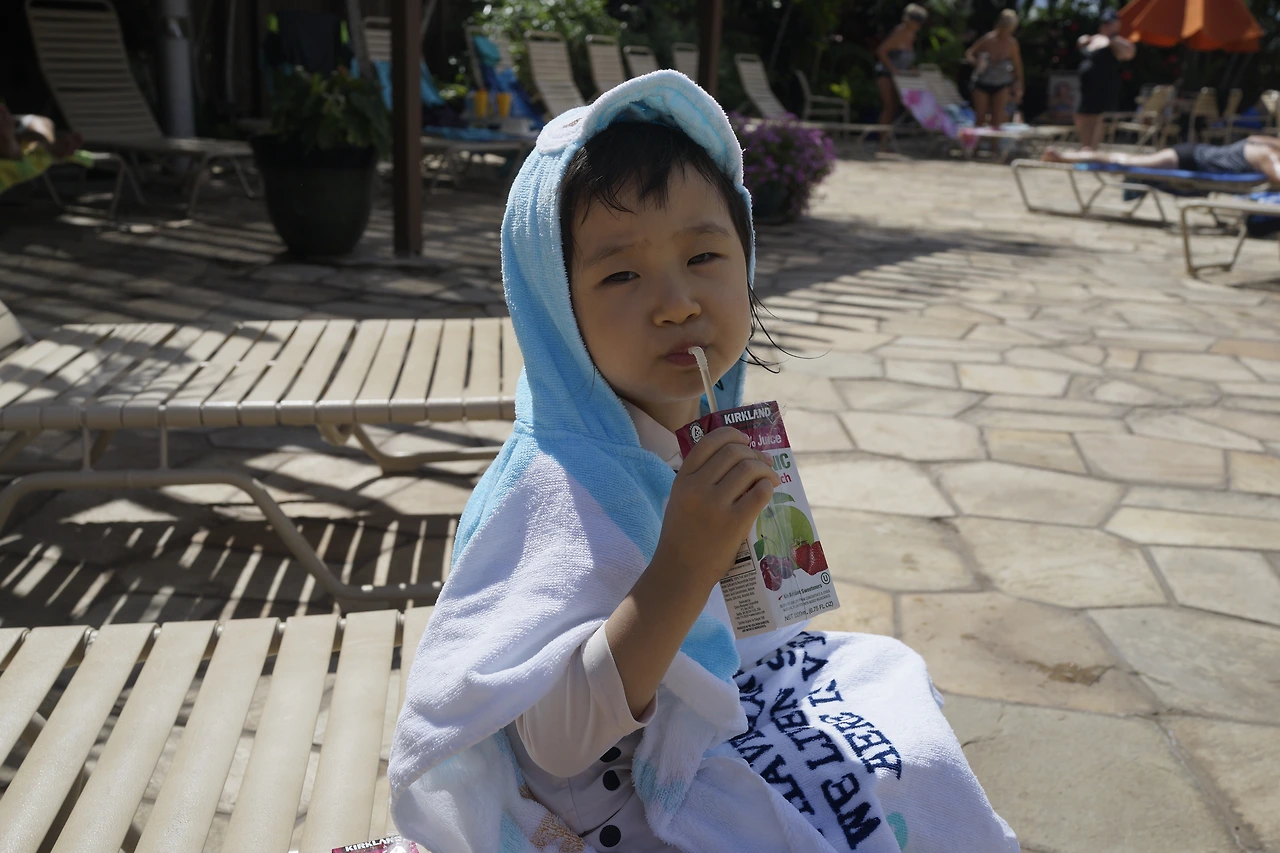 나이 들어서도 여행 와서 독서를 하는 분들이 멋있기는 했지만, 저렇게 풀사이드를 장악하고 계시니 애들 데리고 놀기가 참 조심스러웠다. 18세 이하 금지 풀도 아니었는데 그분들에게 방해될까 봐 아이들에게 "수영장에서 너무 큰 소리 내지 마, 물 튀기지 마, 살살~"이라고 해야 하는 상황이 좀 어이없긴 했다.