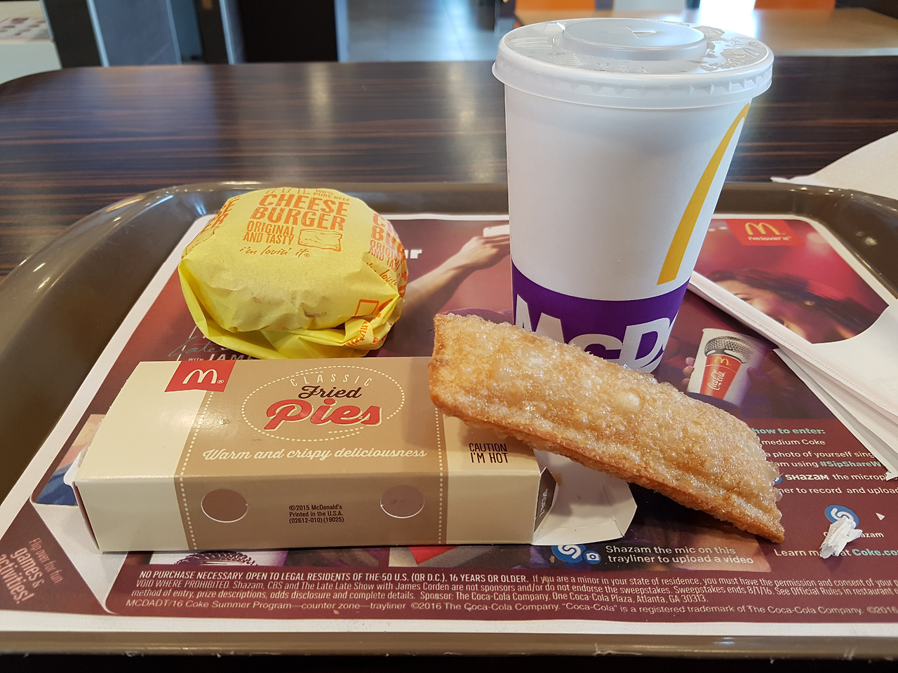 잠시 후 맥도널드에 도착했다. 차량털이범이 나와도 전혀 어색하지 않을 것 같은 동네라, 난 차가 보이는 창가 쪽으로 자리를 잡았다. 그러고 보니 점심도 제대로 먹지 않아 이 정도 허기면 맥도널드 햄버거를 원샷도 가능할 것 같았다. 난 맥도널드를 처음 와보는 사람처럼 메뉴판을 보고 한참을 고민하다 치즈버거, 애플파이, 콜라를 시켰다. 그때 쿼터 8개를 거슬러주던 여자애는 더 이상 일하지 않았고, 트럼프를 지지할 것처럼 보이는 덩치 좋은 백인 아저씨가 카운터를 보고 있다.