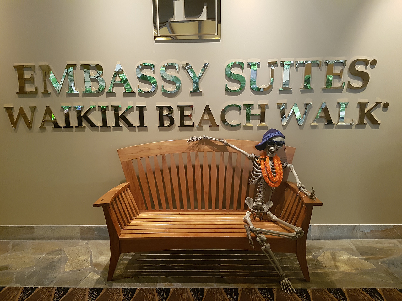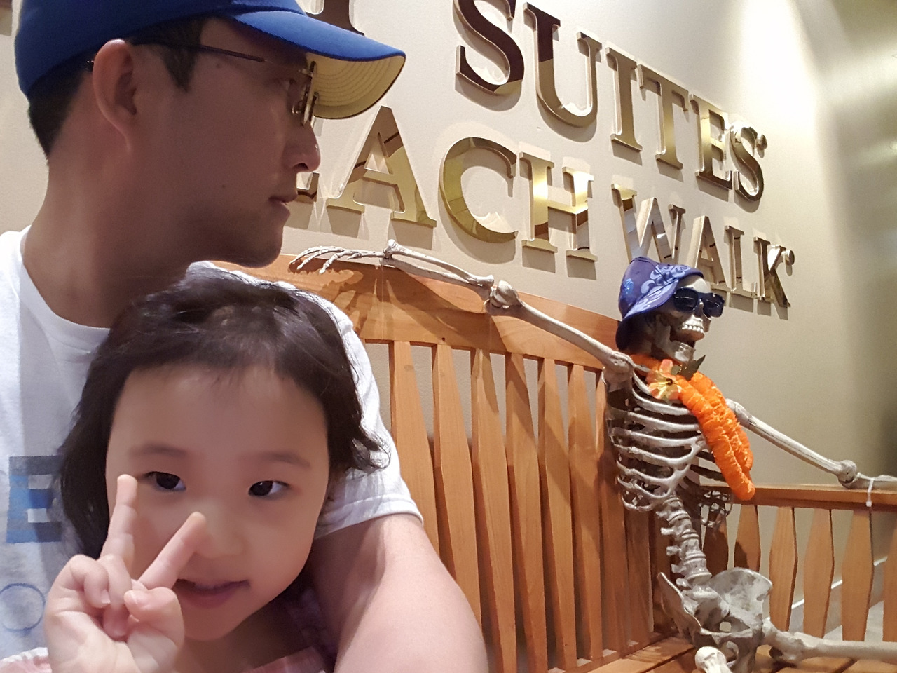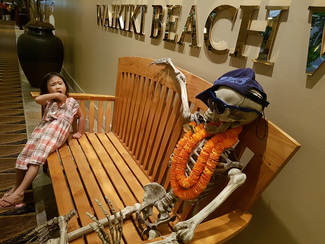 애들이 짜증내지 않을 정도로만 적당히 쇼핑을 마치고 기분 좋게 다시 호텔로 돌아왔다. 호텔 로비에는 Halloween이라고 벤치에 해골을 앉혀 놓았다. 아이들에게 세상에서 가장 힘세고 용감한 이 아빠가 낮에 혼자 다이아몬드 헤드 갔다가 진짜 해골을 발견해서 여기 놔둔 거라고 했는데, 역시 우리 애들은 진짜 믿었다. 내가 직접 해골을 업어 왔고, 체크아웃하기 전까지 우리 아이들이 볼 수 있도록 여기 벤치에 앉혀 놓기로 호텔 측과 이야기를 끝냈다고 했더니, 아빠를 존경하는 눈빛으로 쳐다봤다.