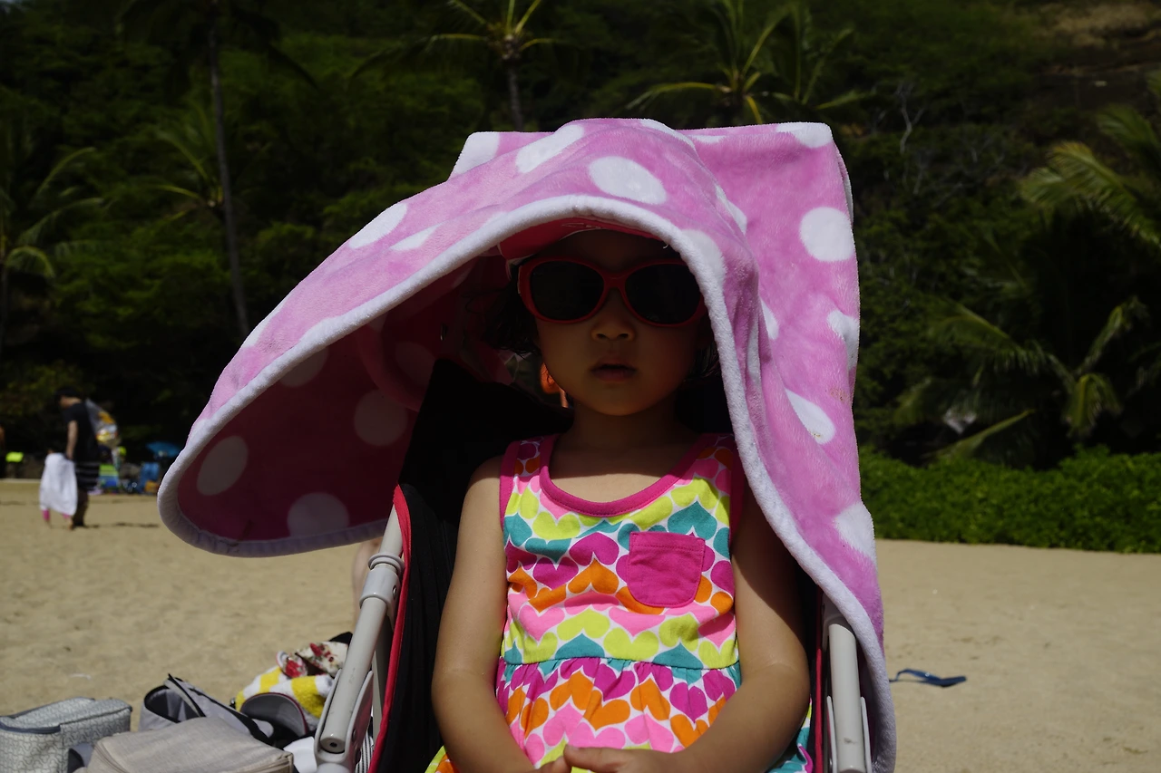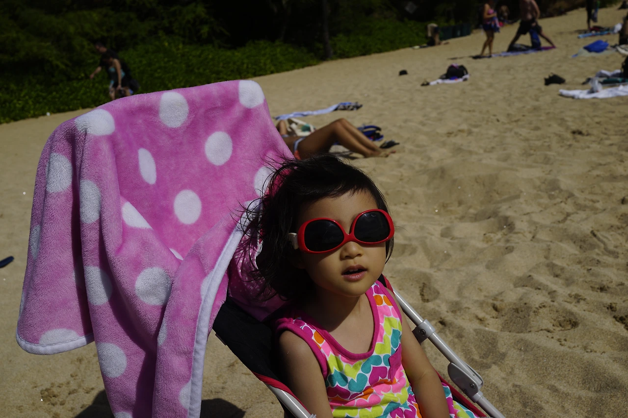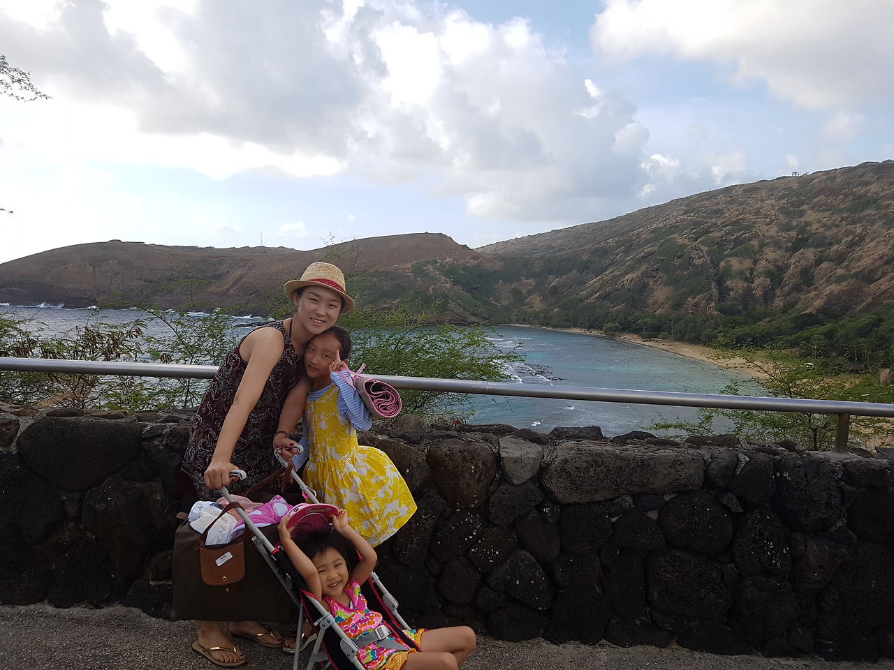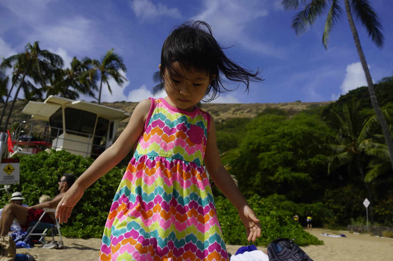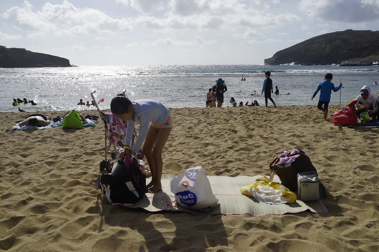 해안가로 내려오니 바람이 더욱 세차게 불기 시작했다. 모래는 당연하고 여기저기 튜브가 날아다니고 파라솔들이 바람에 쓰러지기도 했다. 이번 여행은 끝까지 날씨가 깡패짓을 하구나. 우린 악조건 속에서도 하나우마베이 모래사장 정중앙에 ABC Store에서 3불에 사 온 돗자리를 펴고 자리를 잡았다. 와이프와 지아는 모래사장에서 기다리고 나와 지우는 옆구리 운동 몇 번 같이 한 후 입수했다. 언니만 데리고 가면 항상 난리 치는 지아지만, 바다는 예외였다. 지우만 데리고 들어가는데도, 선글라스와 가운을 입은 채 쿨하게 보내줬다.