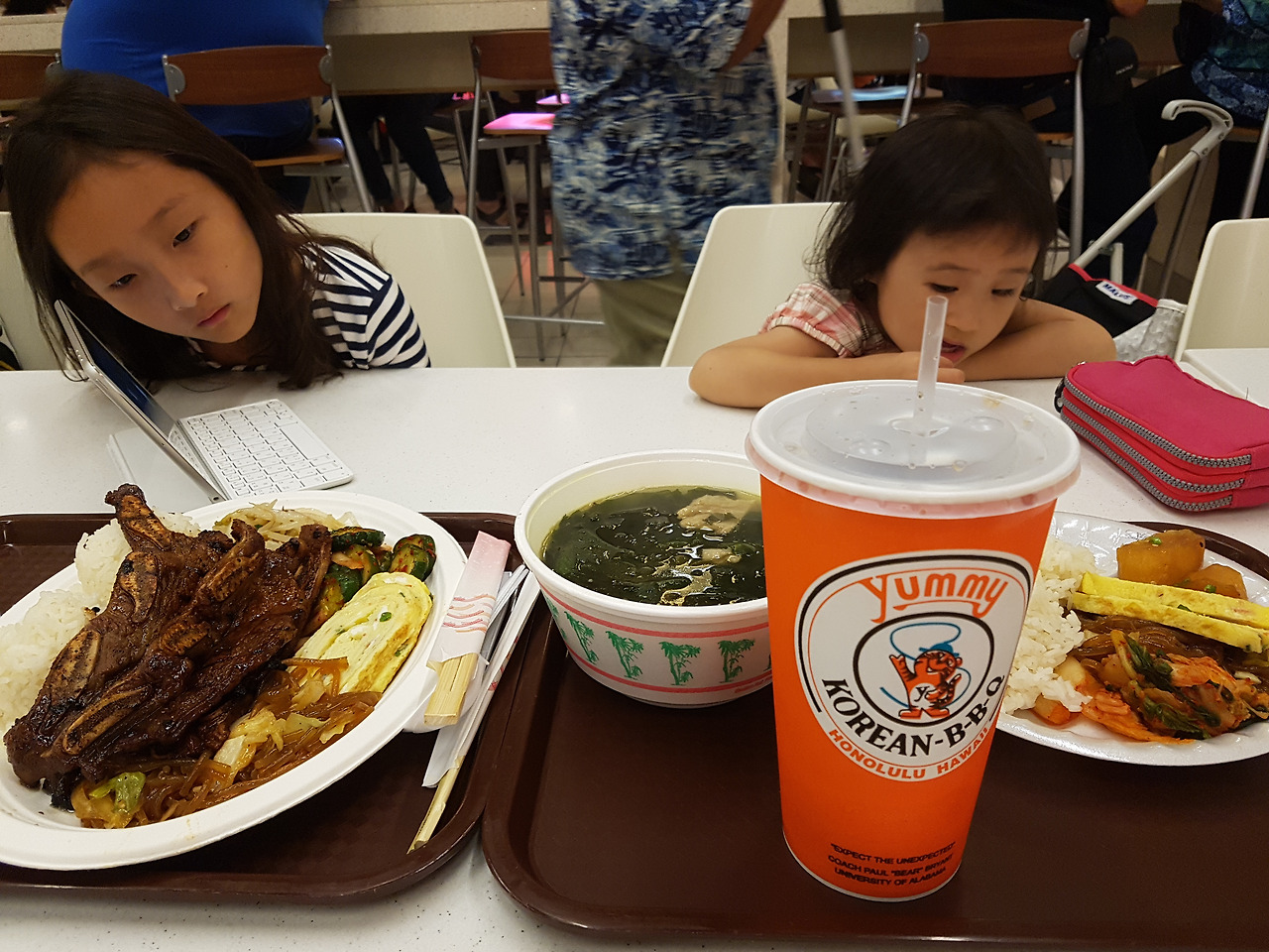 알라모아나에서 Mariposa나 California Pizza Kitchen에서 팁 좀 뿌리며 중급 수준의 만찬을 즐길까 했는데, 불금이다 보니 자리 잡기가 쉽지 않았다. 둘 다 30분 이상 기다려야 했다. 그래서 만만한 푸드코드로 가서, 추억의 1988 올림픽 마스코트 호돌이가 그려져 있는 Korean BBQ집 'yummy'에서 LA갈비와 미역국, 잡채밥을 주문했다. 점심은 3.5불짜리 맥도널드를 먹고 저녁은 푸드 코트라. 나 지금 베트남 여행 온건가.