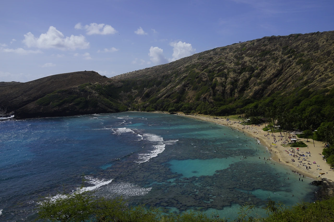 해변으로 내려가면 바람이 잦아지리라 희망을 가지고 7.5불을 내고 입장했다. 이곳에서 경거망동하며 자연을 해치지 말고 산호를 밟지 말라는 10분간의 시청각 교육을 받고, 하나우마베이로 내려갔다. 바다는 예상대로 예뻤는데, 사진을 너무 많이 봐서 그런지 예전에도 와 본 느낌이 들며 큰 감탄사는 나오지 않았다. 앞으로 좋은 곳에 갈 땐 관련 사진은 적당히 보자.