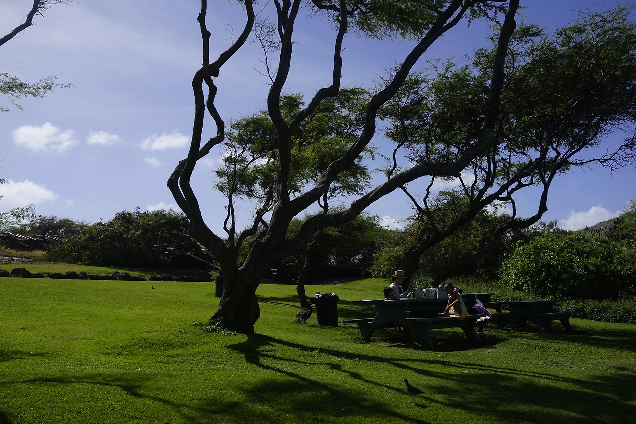 지우를 데리고 마지막으로 한 번 더 들어갔다 나온 후 철수를 결정하였다. 얼마나 벼르던 하나우마베이였는데 이렇게 일어나야 하다니. 점심 도시락까지 싸왔는데 이대로 떠나긴 아쉬워, 하나우마베이 공원 벤치에서 도시락을 먹었다. 그곳에서도 생수통마저 넘어질 만큼 바람이 많이 불었지만 그래도 밥, 김, 장조림만으로 훌륭한 한 끼를 해결하였다. 이 곳에서도 역시 새들은 걸어 다녔고, 아이들은 새를 잡으러 뛰어다녔다.