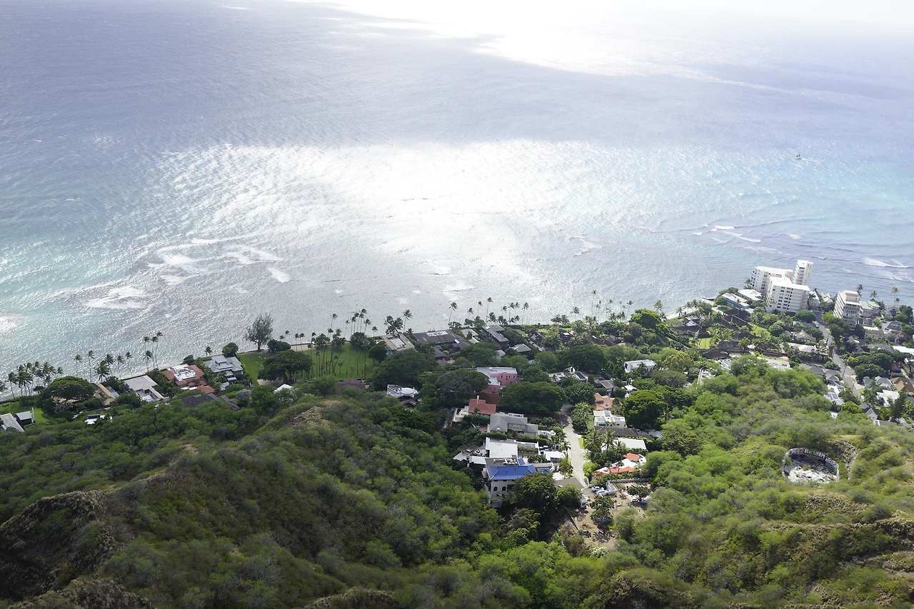 아, 이건 아니다 싶었지만 이미 늦었다. 자유시간은 제깍제깍 흘러가고 있었고, 여기까지 왔으니 한 번 올라가 보기로 했다. 최대한 조리 끈에 부담이 가지 않을 걸음걸이로 조심스레 올라갔더니 정상까지 30분 정도 걸렸다. 정상에서 내려다보니, 와이키키부터 남서부 하와이가 한눈에 들어왔다. ‘와, 멋있다’라는 기분이 잠시 날 찾아왔지만, 내 안에서 30초 이상은 머무르질 않았다. 역시 난 높은 곳에 올라 아래를 내려다보는 행위에는 큰 감흥이 없었다. 더구나 좀 전에 하나우마베이 공원에서도 바람에 생수통이 넘어질 정도였는데, 산 정상인 여기는 어땠겠는가. 모자를 두 손으로 꽉 누르고 있지 않으면 훨훨 날아가 마우이에서 발견될 것 같은 미친바람이었다.