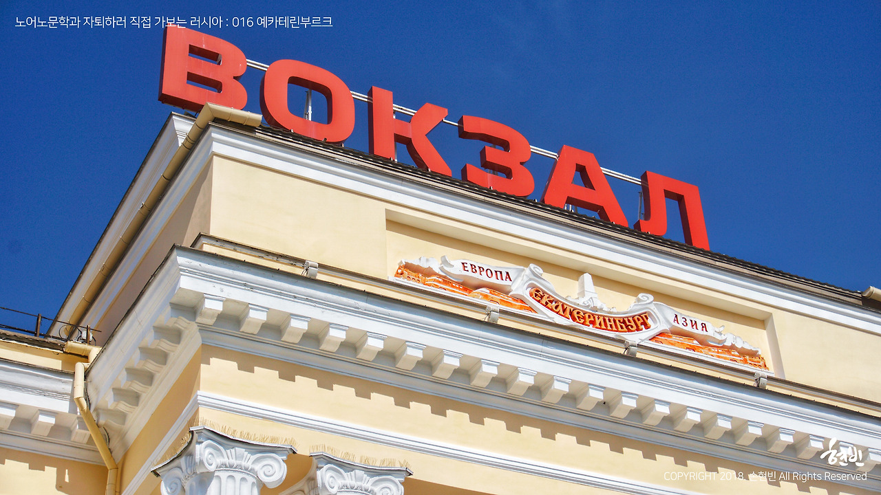 예카테린부르크역. 커스터드 같은 색깔의 건물에 '유럽-예카테린부르크-아시아'가 적혀 있다. ⓒboybeen