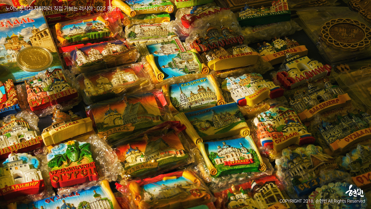 수즈달 시장에서 엄청 고민했던 자석들. 특산품이 오이라서 왼쪽 아래에 오이 모양의 자석도 있다. ⓒboybeen