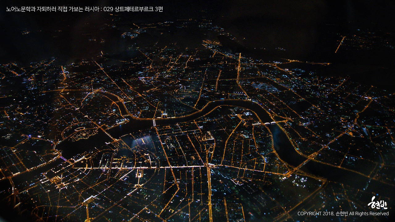 비행기에서 내려다본 상트페테르부르크의 야경. 굽이치는 네바강과 곳곳의 운하가 구름 속으로 사라질 때까지 최대한 눈에 담아 보다가, 그 풍경을 보내주었다. ⓒboybeen