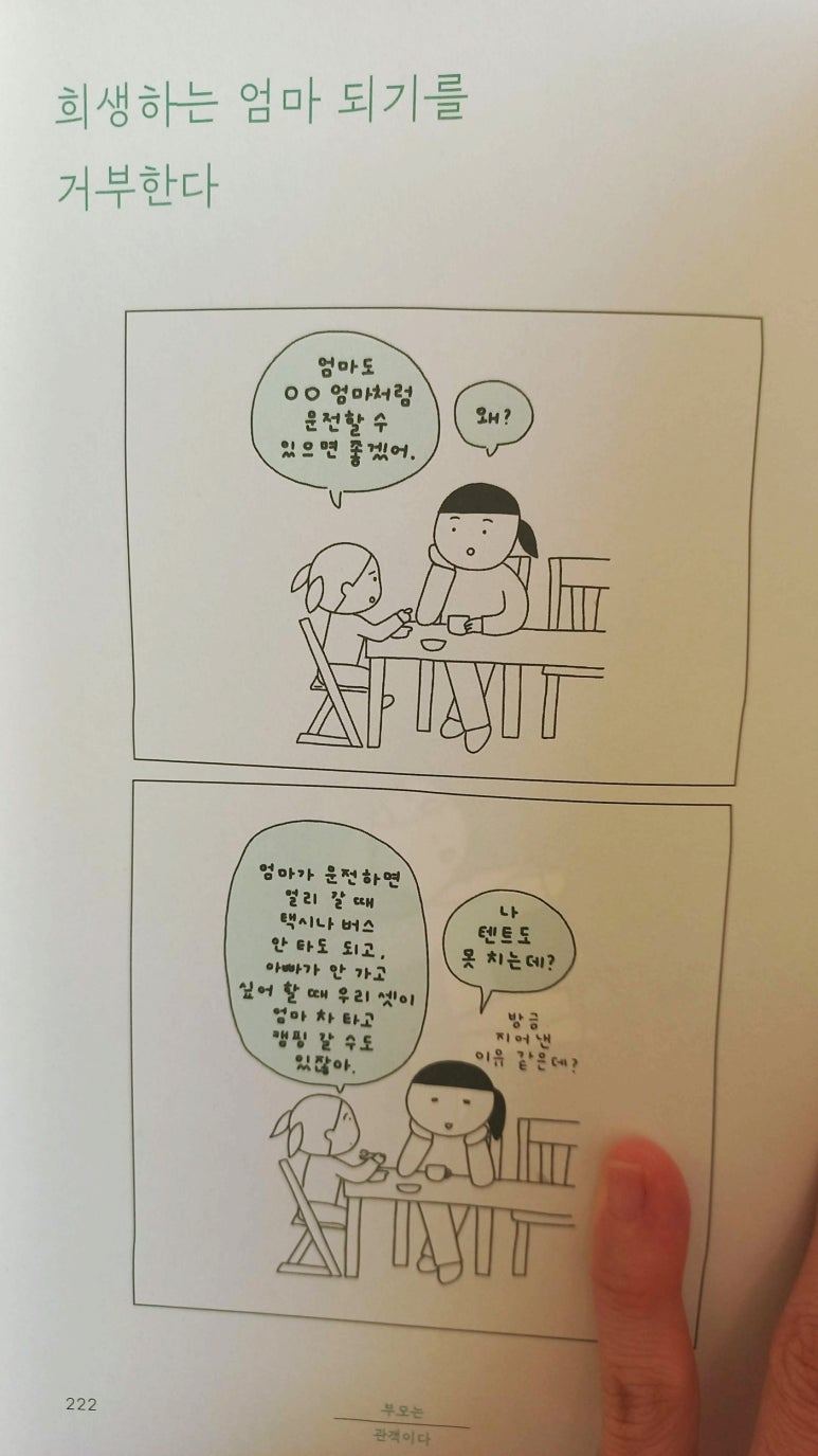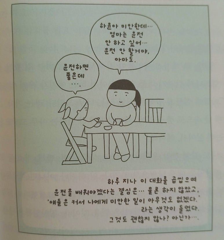 얼마 전 인상 깊게 읽은 책, 박혜윤 글, 유희진 그림 <부모는 관객이다>의 한 장면이다. '희생과 강요가 없는 가족'이라는 부분이 굉장히 마음에 들었는데, 나와 남편도 이미 그렇게 살고 있다는 생각이 들었다. (원치 않는) 면허를 따고, (원치 않는) 자동차를 마련한다는 상당한 희생을 거부하고, 우리 둘 다 '그렇게까지?'라고 생각하는 거 보면 말이다.