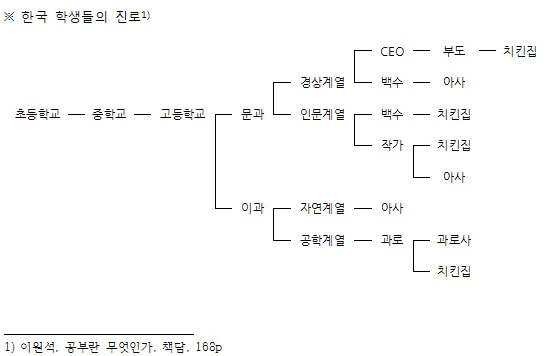 치킨집 창업이 늘어나다 보니 인터넷에 '치킨트리'라는 유머도 생겼다. '공부란 무엇인가'라는 책에서 한국 청년들의 현실은 문과든 이과든, 또는 취업자 거나 실업자 거나 모두 '치킨집' 아니면 '아사'라는 단순 명쾌한 도식을 그렸다. 이미 중·고등학생들 사이에서는 "1·2·3 등급은 치킨을 시키고, 4·5·6 등급은 치킨을 튀기고, 7·8·9 등급은 치킨을 배달한다."라는 말이 유행처럼 돌 정도다. 치킨은 단순히 별미를 떠나서 인간의 최종 목적지이며, 경쟁에 맞추어 치킨을 먹을 것인지, 튀길 것인지, 배달할 것인지가 결정된다. 기승전치킨의 삶이다.