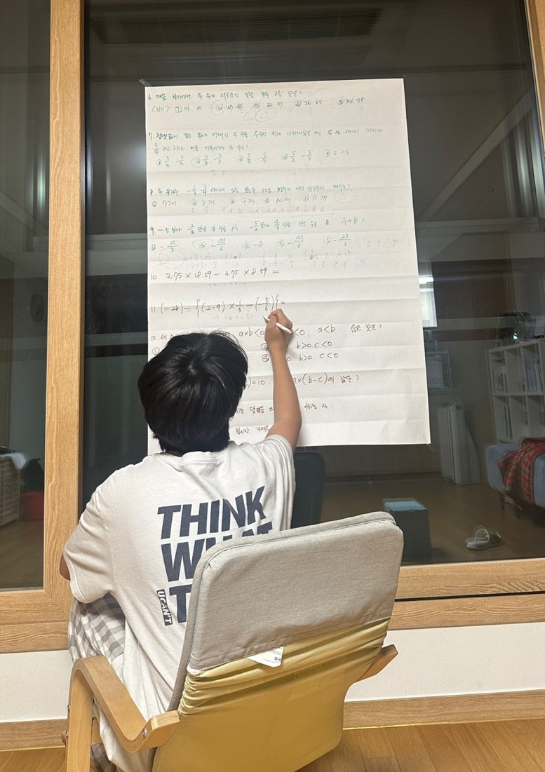 시험 직전 수학 공부는 교과서를 중심으로 진행했다. 일단 교과서에 나와 있는 개념을 확실하게 파악하고, 교과서에 실린 단원평가 문제 오답과 기출문제 오답을 전지에 모두 적었다. 밤아는 학교에서 칠판 쪽으로 나가 친구들 앞에서 문제를 풀듯이 가족들 앞에서 설명을 하며 답을 구했다. 열심히 설명하며 멋지게 답을 도출했는데, 객관식 보기에 답이 없었다. 모두가 웃으며 다시 한 번 계산한 결과 정답이 나왔다. 그렇게 밤아는 오답을 정확하게 자신의 것으로 만들었을 것이다.