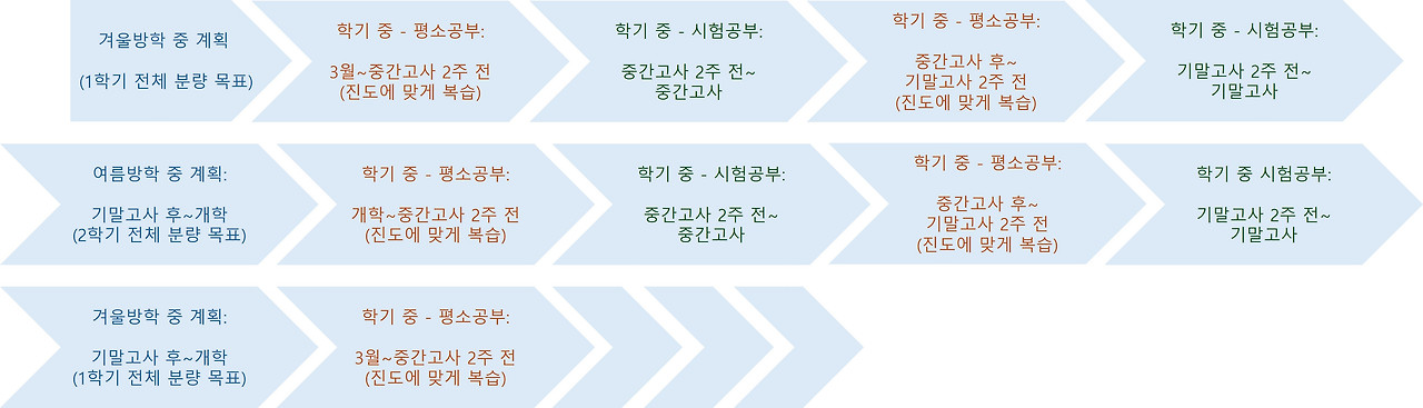 방학과 학기 중의 학습 스케줄 작성은 약간의 차이가 있다. 방학은 다음 학기를 위한 예습의 시간이기 때문에 최대한 한 학기 전체를 훑어볼 수 있도록 넓은 범위를 잡아야 한다. 알고 수업을 듣는 것과 전혀 모르고 수업을 듣는 것은 천지 차이이기 때문이다. 영어권 나라에 가면 단어 하나라도 알아들어 보려고 귀를 쫑긋 세우고 듣지만, 베트남이나 태국 등의 나라처럼 전혀 모르는 언어 앞에서는 들어봤자 모른다는 마음이 강해 청취 자체에 큰 의욕이 없다. 오히려 핸드폰에서 파파고 번역을 누르느라 바쁘다. 이렇듯 학교 수업도 마찬가지로 조금이라도 알고 들어야 들린다. 전혀 모르는 내용은 그저 드라마 속 백그라운드 뮤직이나, 외국어처럼 들릴 뿐일 것이다. 그래서 방학은 다음 학기에 학습할 내용을 미리 훑어보는 시간으로 삼고, 최대한 다음 학기 내용의 전부를 담을 수 있는 스케줄을 마련해야 한다.