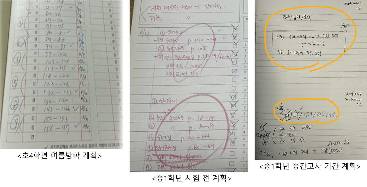 진정한 자기주도학습은 스스로 공부할 것을 선택하고, 본인의 의지에 따라 배움을 주도적으로 끌고 나갈 때 가능해진다. 이를 위해 가장 중요한 것은 학습의 주체가 바로 학습자 본인이라는 것을 자각하는 것이다. 학습자 본인이 학습 시간의 소유권자이고, 학습의 시간을 주도할 수 있는 책임자라는 것을 인식해야 보다 효율적인 학습 주도가 가능하다. 이를 위해 전략적인 계획이 반드시 필요한데, 아이가 처음부터 계획을 스스로 세우는 것은 생각보다 어렵다. 초등학교 저학년 어린이가 여름 방학을 대비해 동그라미 안에 24시간을 표기하고 하루의 일과를 적어 넣는 것과는 차원이 다른 작업이다. 3월 학기 초부터 중간고사 2주 전까지의 계획, 중간고사 2주 전부터 중간고사 마지막 날까지의 시험을 전후로 둔 계획, 여름 방학과 겨울 방학을 위한 방학 중 계획이 반드시 필요하다.