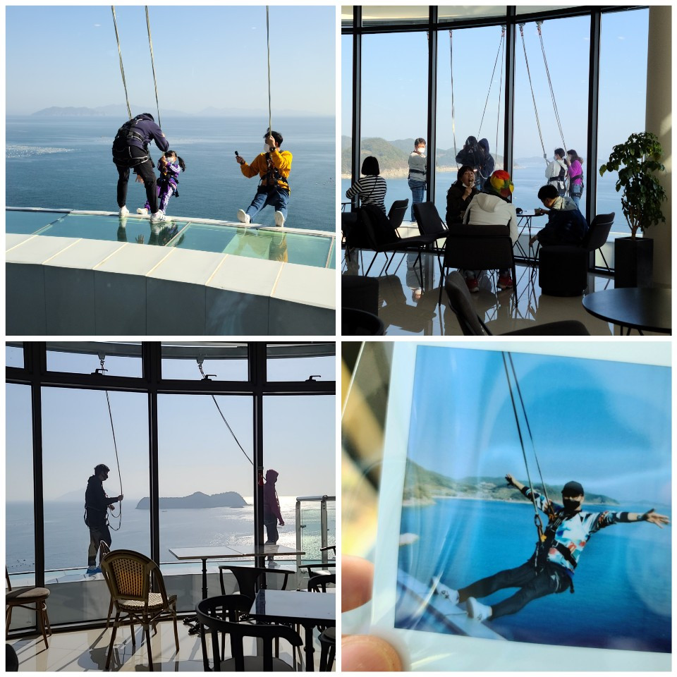 아침 일찍 와도 역시나..... 세계에서 제일 부지런한 한국 어르신들이 먼저 와 있다. 2층 카페에서 간단히 식사를 하고, 스카이 워크를 신청했다. 로프 하나에 몸을 매달고, 전망대 주위를 돌면서 마지막에는 낭떠러지 쪽에 배영을 하는 듯한 포즈를 취하면서 사진 찍는 코스다. 겉으로 볼 때는 안 무서웠는데 막상 해보니 다리가..... 은근히 고소공포증이 있어서, 바깥이 보이는 엘리베이터도 잘 못 탄다.