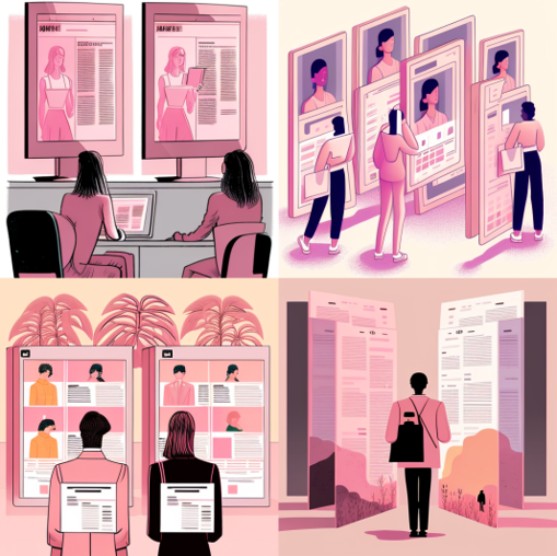 위 그림은 생성형 AI 미드저니 midjourney를 활용해 그린 삽화로, 기업이 여러 지원자의 이력과 역량을 검토하고, 지원자는 기업의 다양한 정보를 확인 후 상호 선택하는 긱 이코노미의 모습을 그려낸 것이다.
