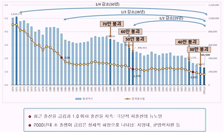 우리나라는 인구구조의 변화로 인한 어려움을 겪고 있다. 한국경제연구원의 조사인 '인구구조 변화와 향후 대응 과제 (유진성, 2021)'에 따르면 우리나라의 합계 출산율(가임기 여성(15-49세) 1명이 가임기간(15-49세) 동안 낳을 것으로 예상되는 평균 출생아수)은 OECD 국가 가운데에서도 가장 낮은 0.78명을 기록하고 있다.