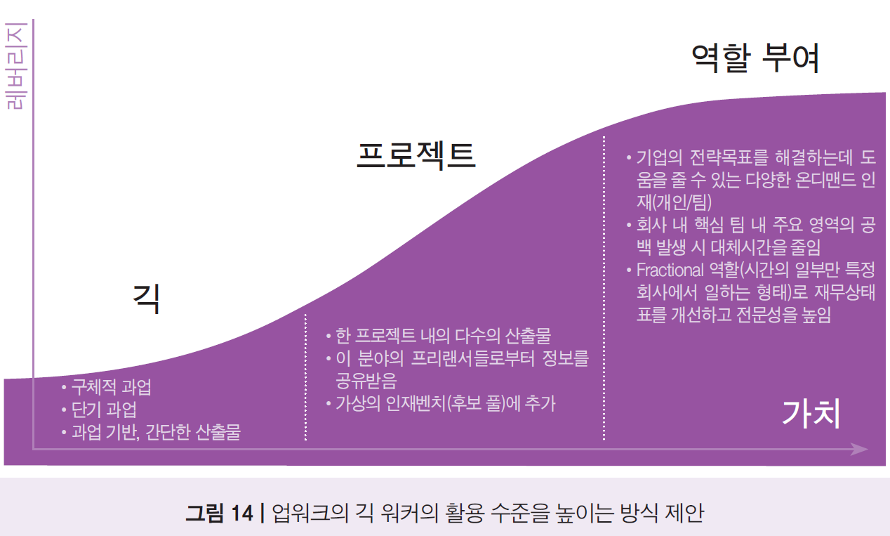 전략적인 가치가 낮은 일은 구체적 단기 과업 위주의 작은 산출물을 얻을 수 있는 긱 gig 형태로 인재를 활용한다. 그보다 더 가치가 높은 일에는 하나의 프로젝트 안에 다양한 산출물을 얻을 수 있는 프로젝트 project 형태로 외부 인재를 활용한다. 그리고, 회사의 전략적 목표 달성을 위한 가치가 높은 일에는 긱 워커에게 상시적 역할을 부여해 팀의 부족한 역량을 보완하고, 전문성을 높여 재무성과에 기여하는 형태로 인력을 적극 활용한다.