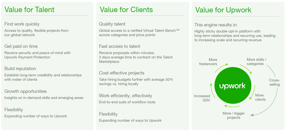 업워크는 고객기업이 플랫폼을 통해 경제적이고 효율적으로 인력 충원을 할 수 있도록 돕는다. 이들은 특히 플랫폼의 사용자 중 고객의 관점을 보다 중시하는 경향을 보이는데, 고객에게 크게 3가지 가치(품질, 비용, 안전성)를 소구 한다.