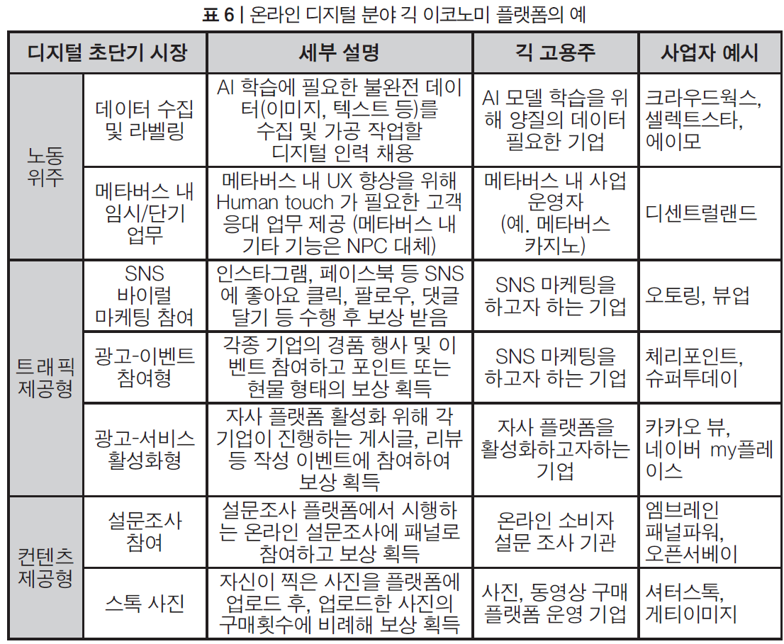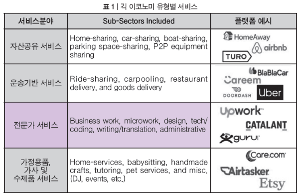 아래는 이 리포트에서 발표한 다양한 온라인 디지털 분야 긱 이코노미 플랫폼의 예이다.
