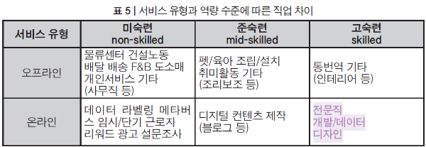 이 리포트는 긱 워커를 다음 그림처럼 필요 역량 수준에 따라 구분하기도 하였는데 구직자 수 및 채용빈도 관점에서 볼 때 고숙련 skilled , 준숙련 mid-skilled, 미숙련 non-skilled 긱 워커 중 준숙련 및 미숙련 긱 워커가 85%를 차지하였고, 고숙련 긱 워커는 최대 15%에 불과한 것으로 나타났다.