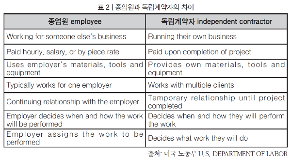 셋째, 결과와 산출물에 관해서만 고용주의 통제를 받는다. 일의 과정이나 방법에 대해서는 고용주가 관여하거나 통제하지 않는다. 약속된 결과/산출물을 내기 위해서 필요에 따라 외부에 도움을 받을 수 있는 추가적인 고용이나 인력 소싱을 자의적으로 진행할 수 있다.